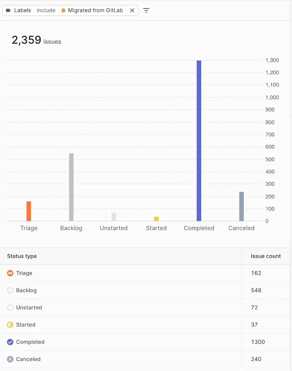 Migrating labels was a bit tricky. Both GitLab and Linear support some sort of label grouping, but in Linear the group name is not included in the label name as in GitLab (where we have scoped labels,:: acting as separator between the group and the label. Labels must be unique in Linear, not just within a group, so you can’t have a colors/green and eco/green label at the same time.
