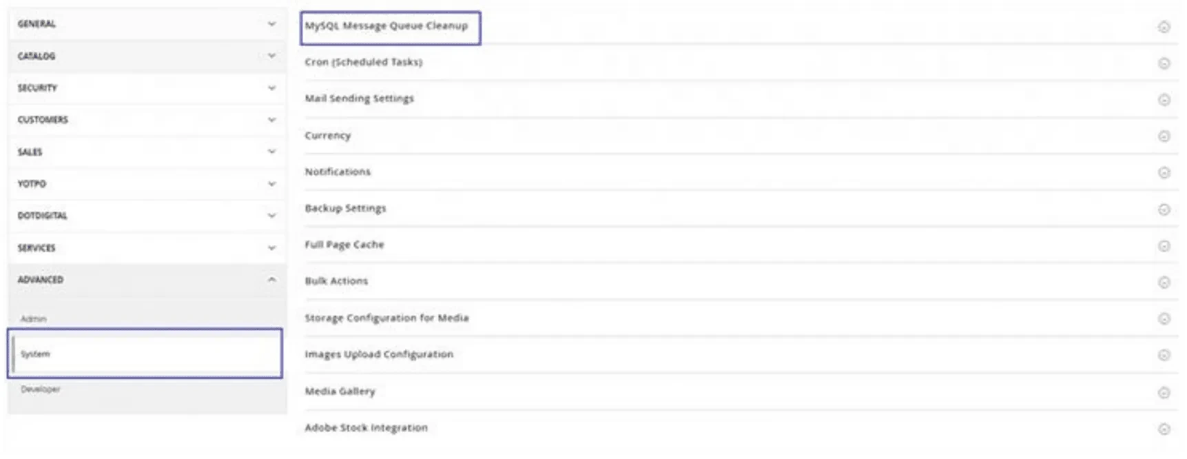 - Upon expansion, choose the ‘System’ tab and open ‘MySQL Message Queue Cleanup’