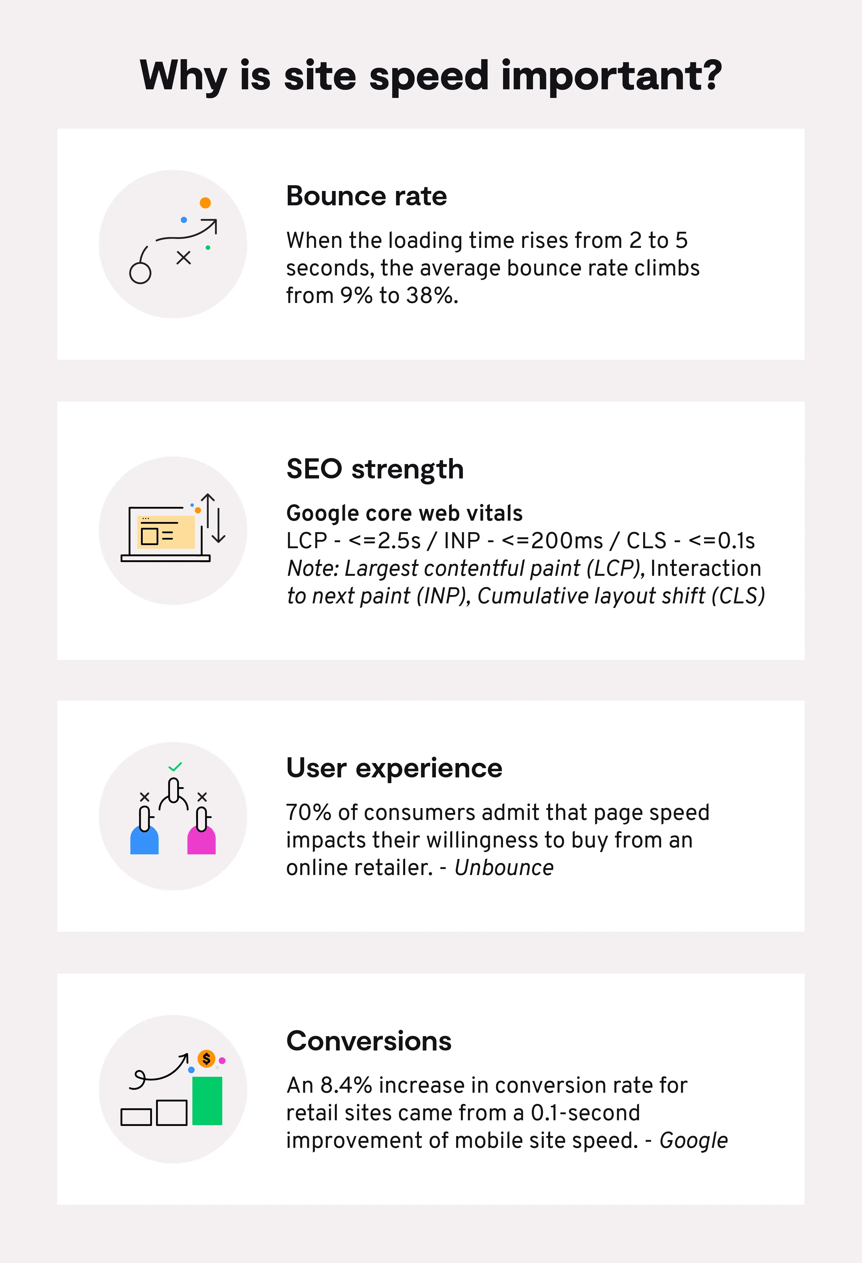 Site speed has a direct impact on factors that determine your ecommerce ROI, such as user experience, conversions, bounce rate, and SEO.
